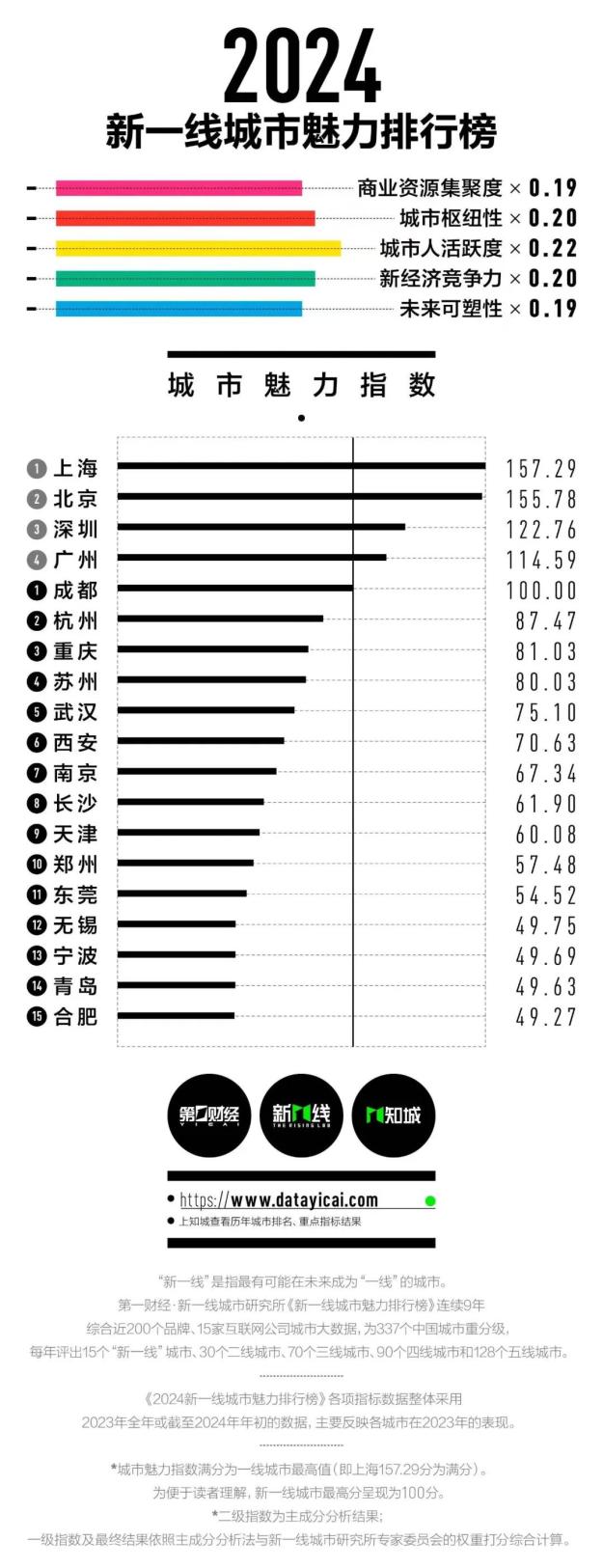 《2024新一线城市魅力排行榜》的指标体系包含了商业资源集聚度、城市枢纽性、城市人活跃度、新经济竞争力和未来可塑性五大一级维度。榜单的一级与二级维度权重以新一线城市研究所专家委员会打分的方式计入,二级维度以下指标数据则采用主成分分析法。榜单各细分维度指标主要采用2023年全年或者截至2024年年初的数据计算得出。