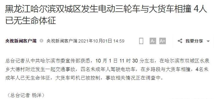 11)1日中午,哈尔滨发生电动三轮车与大货车相撞事故,4名未成年人已无生命体征,大货车司机已被控制。