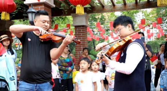 5)10月1日上午,许昌一小区物业组织“红色快闪”活动。两名业主拉响小提琴,深情演奏《我和我的祖国》。业主与物业人员挥舞手中的国旗,庆祝祖国母亲72岁生日。