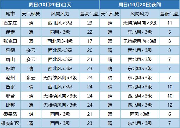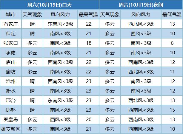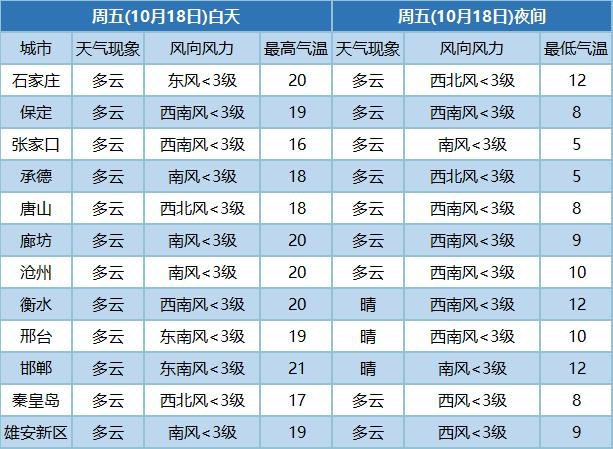 18日,大部地区最高气温继续上升,北部地区设区市(张家口、承德、唐山、秦皇岛)最高气温为16-20℃,中南部地区各设区市为19-20℃;