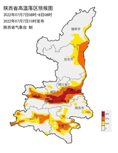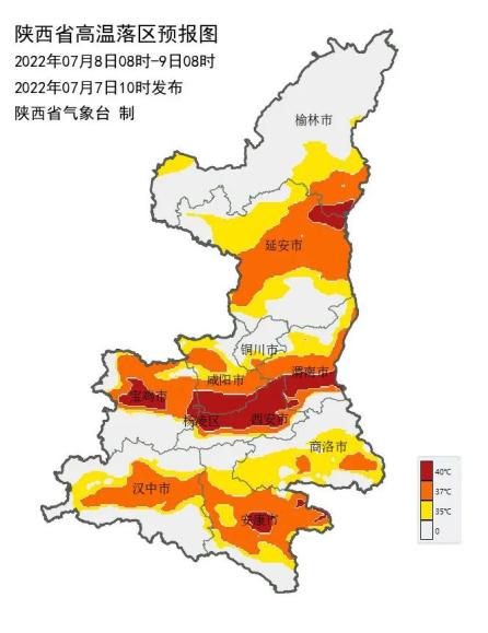 8日榆林东南部、延安大部、关中大部、陕南大部有35℃以上的高温天气,其中宝鸡中部、咸阳南部、杨凌、西安大部、渭南大部、汉中中部、安康部分地方可达37℃以上,榆林东南部、延安东北部、关中平原部分、安康局地最高温度可达40℃以上。