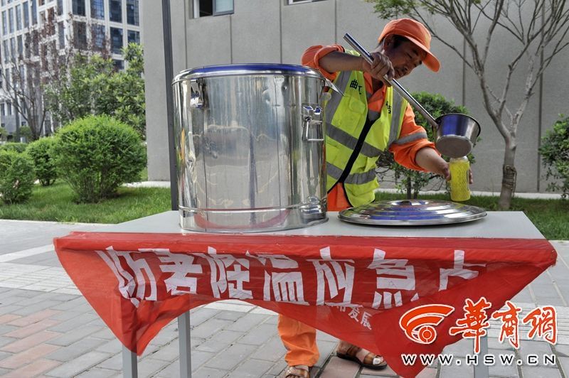7月16日下午,西安气温高达36℃,南三环一防暑降温应急点为环卫工人准备了绿豆汤,刚打完扫路面的蒙师傅前来喝绿豆汤解暑。 华商报记者 强军 摄影报道