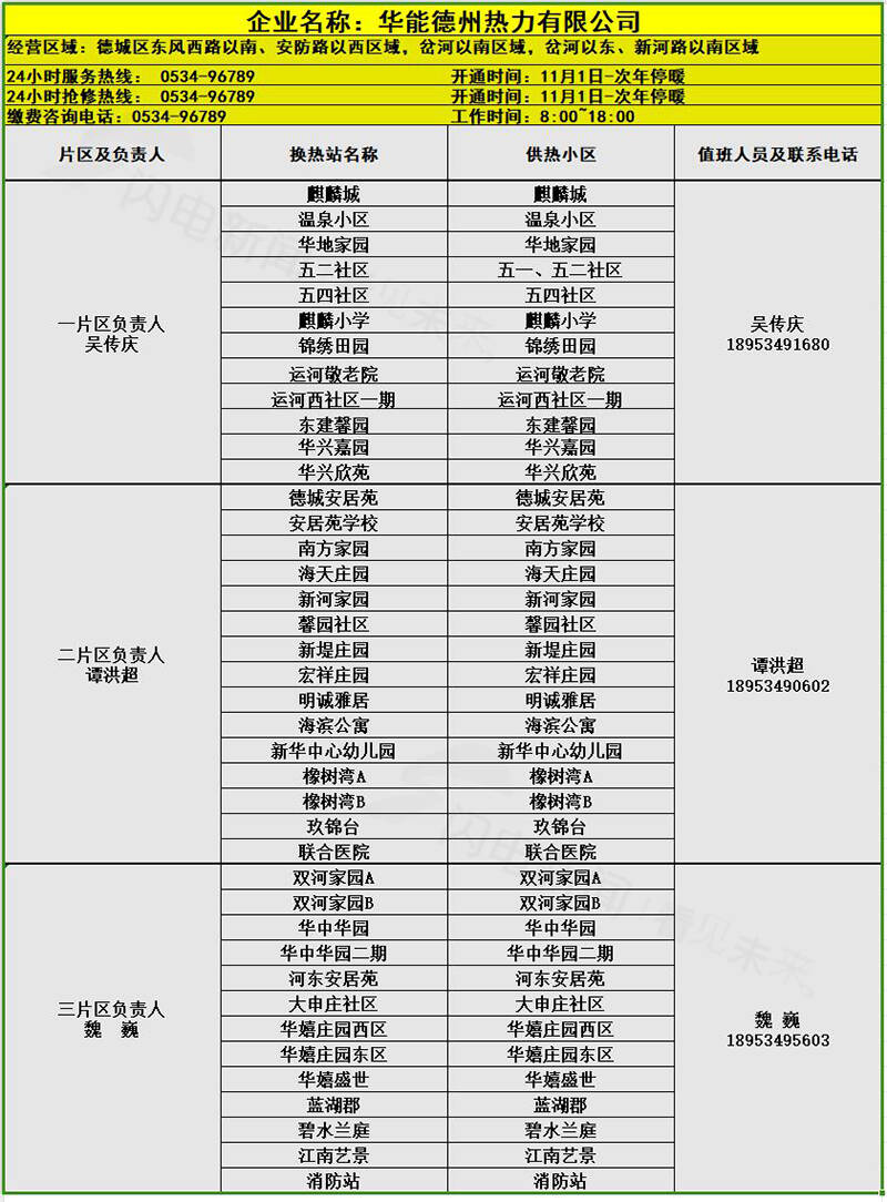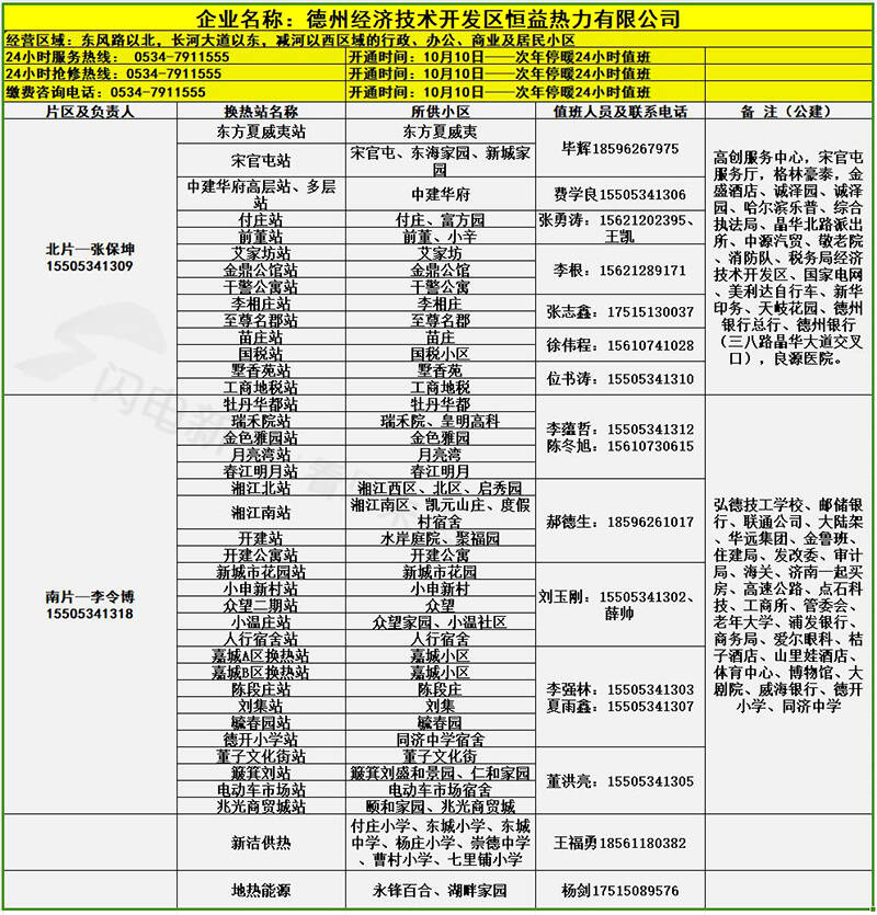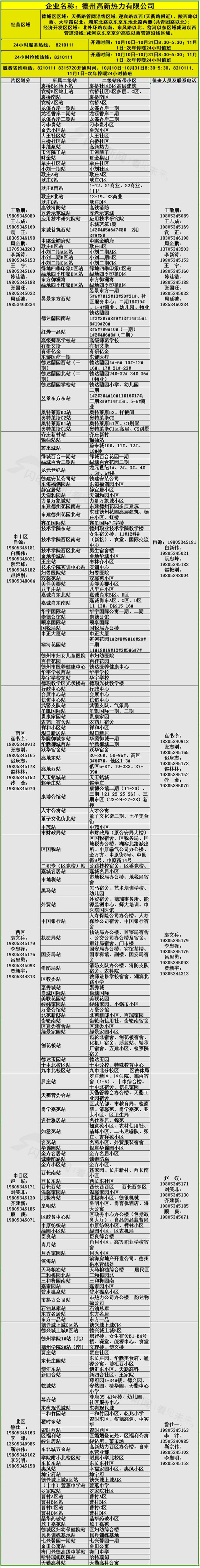 德州中心城区(不含陵城区)共有德州市热力发展有限公司、德州高新热力有限公司、山东华鲁恒升集团德州热电有限责任公司、华能德州热力有限公司、德州恒益热力有限公司5家管道供热企业。服务信息中包含供热企业片区经理及值班人员联系电话。此外,各供热企业还将逐步开通24小时服务热线,随时受理用户求助及投诉。