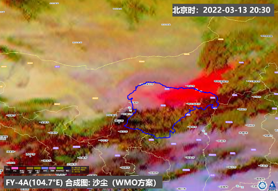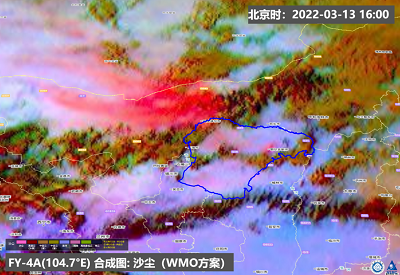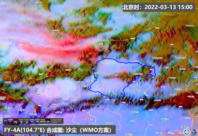 风云四号卫星沙尘天气遥感监测显示(图中粉红色区域),3月13日15时,鄂尔多斯市上游阿拉善盟北部有强沙尘气团逐渐向东扩散,杭锦旗能见度下降,出现沙尘天气。