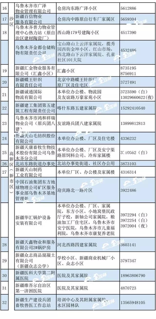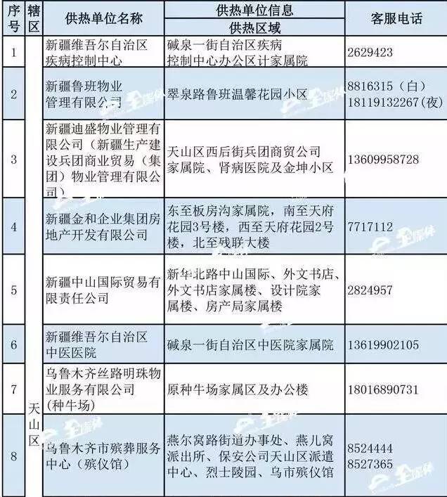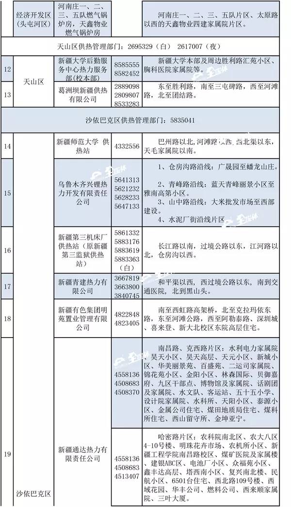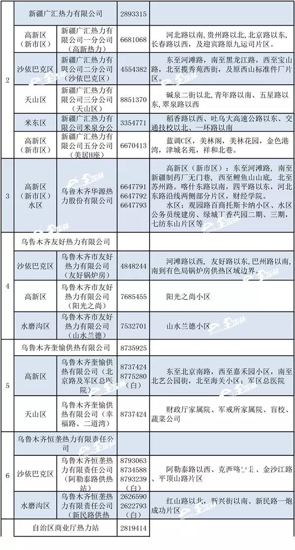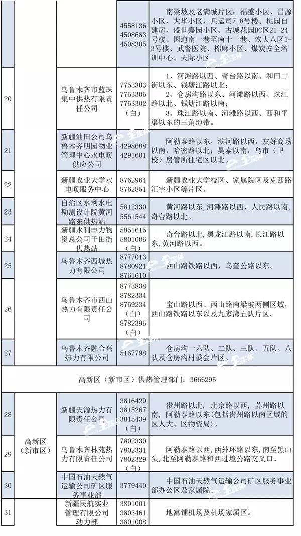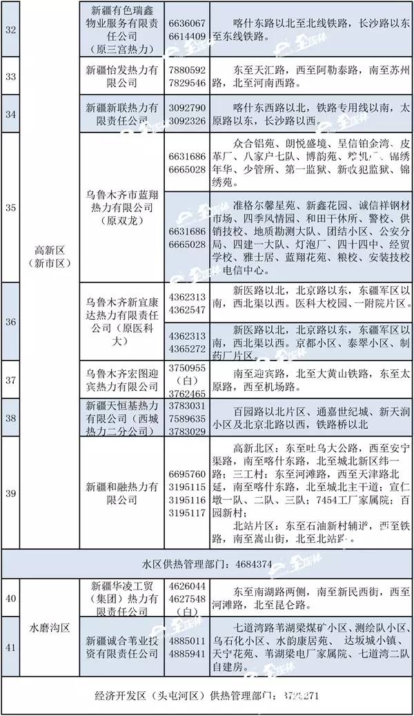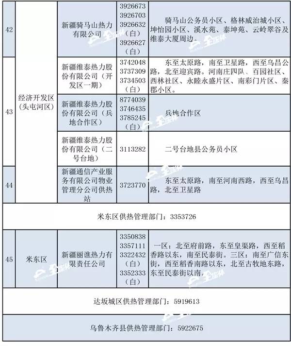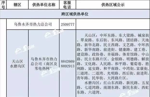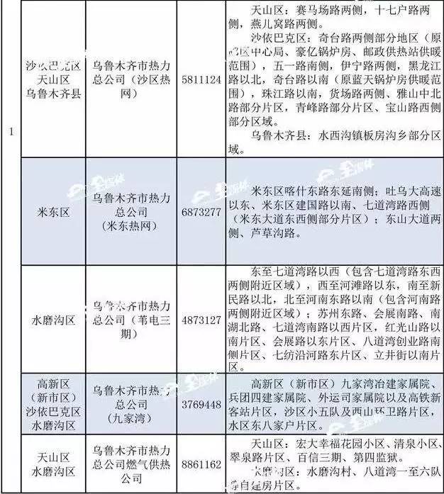 乌市供热行办公布了2016-2017年度采暖期各区县供热管理部门联系方式和首府各供热企业(锅炉房)供热区域的24小时值班电话。如果供热期间,居民家中出现了暖气不热或漏水等供热问题,可以随时拨打所属供热单位的值班电话或向辖区供热管理部门公布电话投诉。
