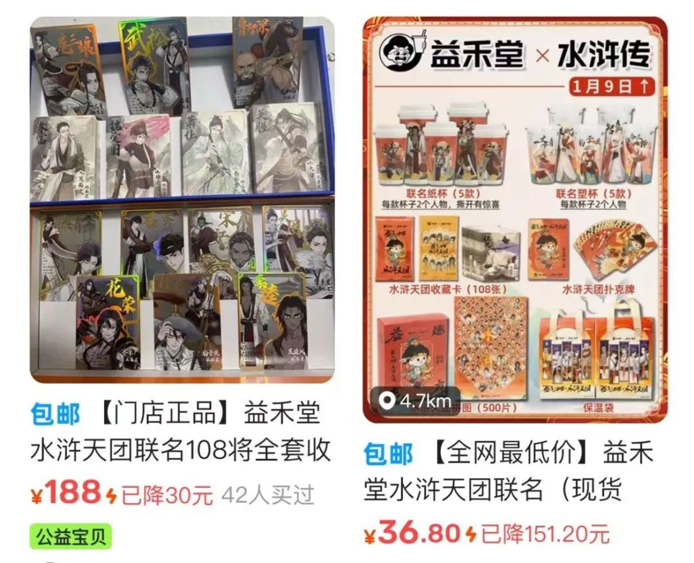 此外,成功联姻各种“经典 IP” 的品牌,也实现了营销突破。茶百道联动《新白娘子传奇》巧妙地与蛇年强势绑定,唤醒消费者的蛇年记忆,引发了一波抢购热潮;益禾堂与《水浒传》联动,以童年集卡回忆为卖点,推出系列特色产品与限量集卡活动,周边供不应求,甚至蔓延到二手交易平台。
