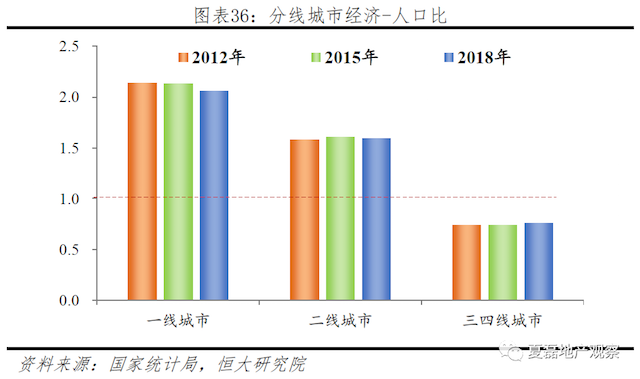 2019~2030年,城镇人口增长、居住条件改善和城市更新改造需求中,三四线城市占比分别为51.3%、54.8%和67.4%,而需求漏损占比高达67.4%。和总需求占比53.9%相比,表明三四线城市需求占比下降主要有两个原因。一是人口净流出。2018年三四线城市的经济—人口比为0.76,人口整体呈净流出态势。二是因为需求漏损较多。三四线城市新增城镇常住人口中行政区划调整占比较高,存在大量带房入城现象。