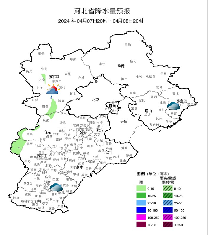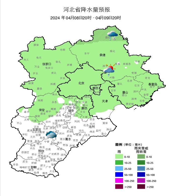 8日夜间到9日,中北部地区多云转阴有阵雨或雷阵雨,其中承德北部有雨夹雪,其他地区多云。渤海海域和沿海地区有东北风5到6级,阵风7级。