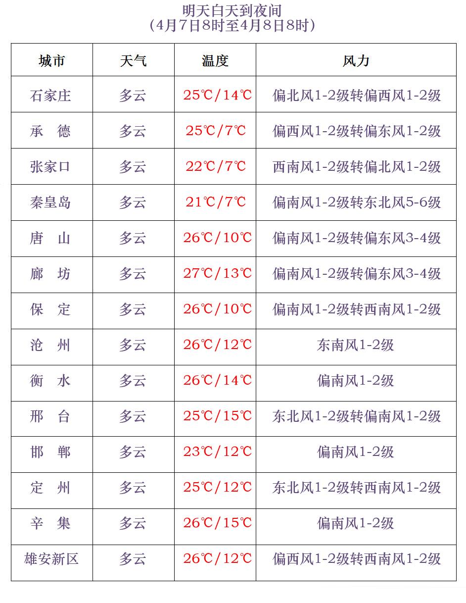 明天夜间到8日,张家口西部、保定西部、石家庄西部多云转阴有阵雨或雷阵雨,其他地区多云。张家口、承德西部有偏南风4到5级,阵风6级,承德东南部、唐山、秦皇岛、保定东部、廊坊、沧州、石家庄东部、衡水有偏东风4到5级,阵风6到7级;渤海海域和沿海地区有北到东北风6到7级,阵风8级。