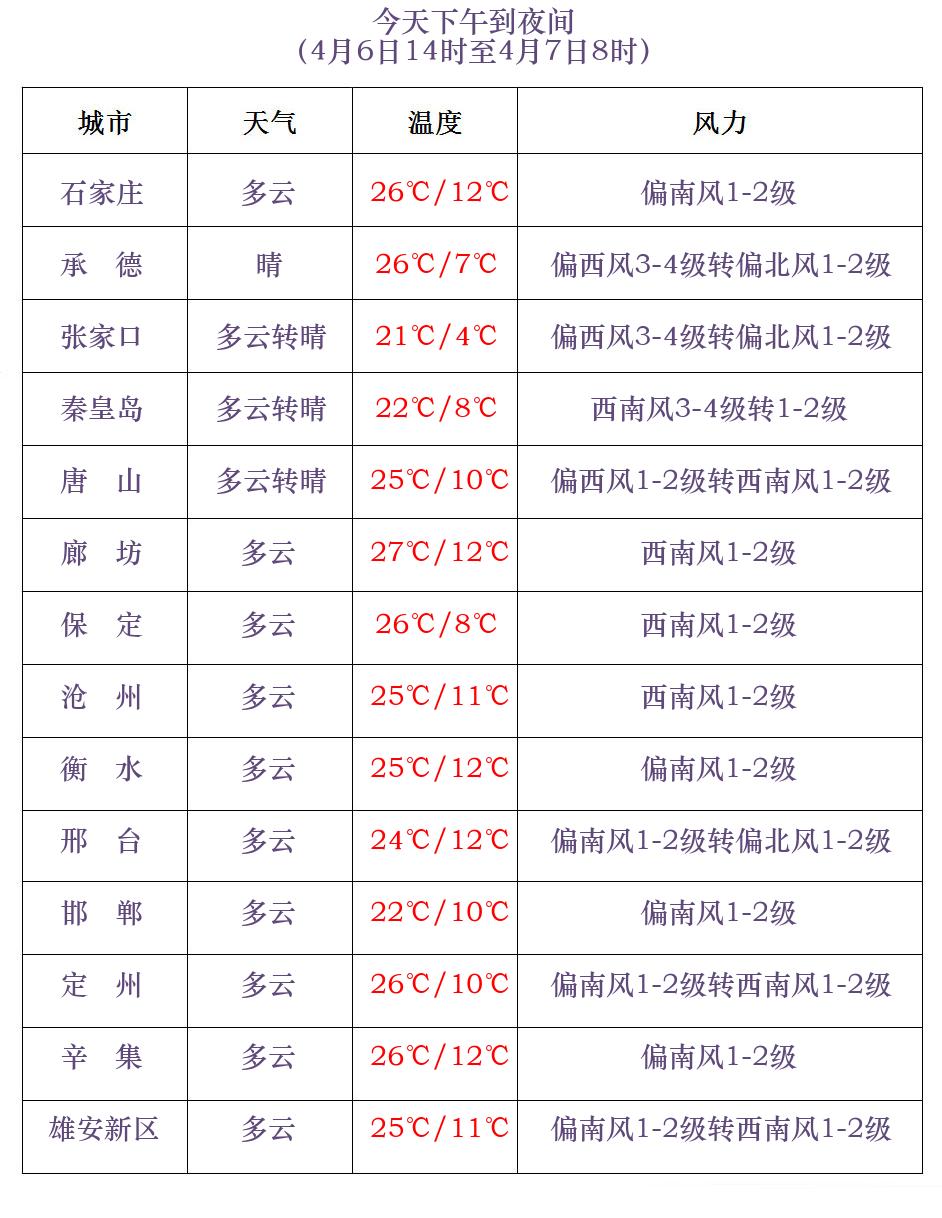 今天下午到夜间,保定、廊坊及以南地区多云间晴,其他地区晴间多云。今天下午,张家口、承德有西北风4到5级,阵风6到7级。