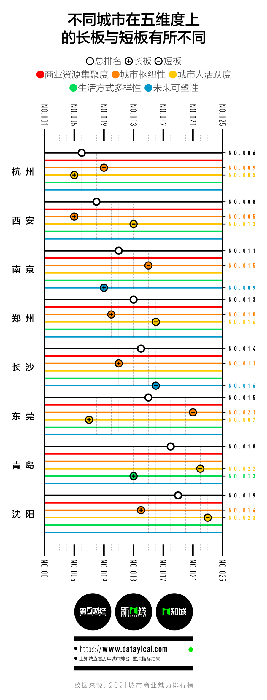 其中,分列13至15位的郑州、长沙、东莞,总排名相对稳定,后四位的争夺则更为激烈。