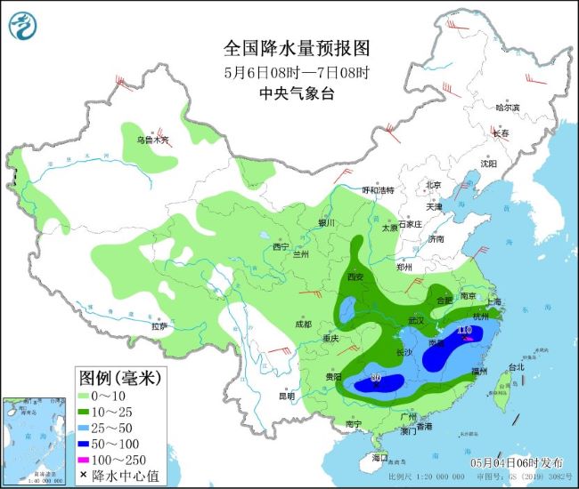 5月6日08时至7日08时,陕西中南部、江汉大部、江淮西部、江南、西南地区东北部、华南北部等地部分地区有中到大雨,其中,湖南南部、江西中部和东北部、浙江西南部、福建西北部、广西北部等地部分地区有暴雨或大暴雨(100~110毫米)。内蒙古中部和西北部、黑龙江东北部、吉林中部、新疆沿天山地区、河南南部、四川盆地西北部、四川南部、贵州东北部等地部分地区有4~6级风,其中,内蒙古东北部、新疆北疆北部等地部分地区有6~7级风(见图4)。