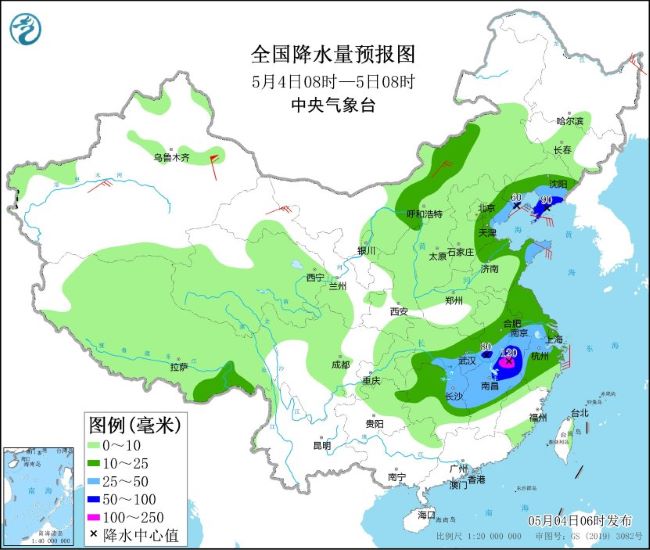 5月4日08时至5日08时,湖北南部和东部、安徽南部、湖南东北部、江西中北部、浙江西部、江苏南部以及山东半岛、辽宁南部、河北东部等地部分地区有大到暴雨,其中,安徽南部、江西北部等地部分地区有大暴雨(100~120毫米)。上述部分地区伴有短时强降水(最大小时降雨量20~40毫米,局地可超过50毫米),局地有雷暴大风等强对流天气。内蒙古中部、黑龙江东北部、新疆南疆盆地、甘肃河西、山东半岛等地部分地区有4~6级风,其中,新疆东部部分地区有8~9级风。渤海、渤海海峡、黄海大部、东海北部海域将有7~8级、阵风9~10级的大风(见图2)。