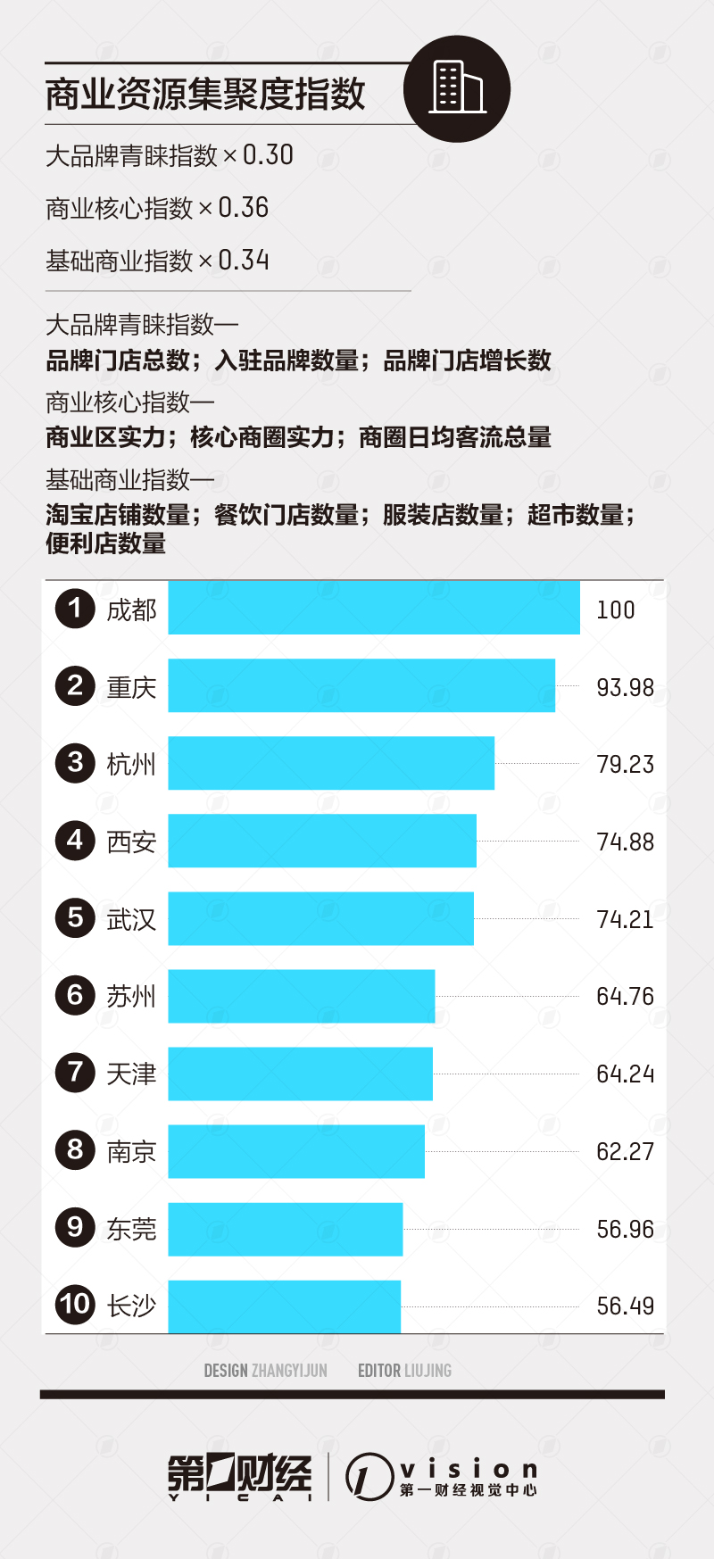 商业资源集聚度是一项借助商业世界的选址研判智慧、评估城市商业实力强弱的数据指标。它从主流消费品牌对城市的青睐程度、商圈实力以及基础商业发展三方面衡量城市的商业繁荣程度。