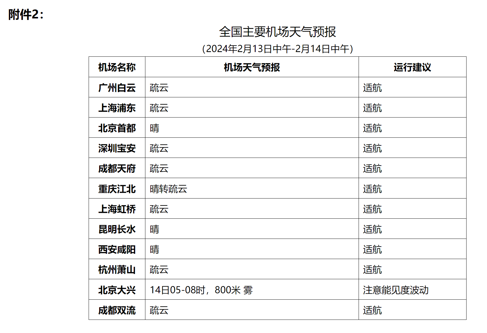 预计13日中午至14日中午,全国大部机场适航(见附件2);内蒙古、山西北部、河北北部、北京、辽宁、吉林、黑龙江、云南、广西等地的中低空空域有轻到中度颠簸;内蒙古东部、吉林东部、黑龙江等地的低空空域有积冰条件。13日午后到夜间,湖南北部、江西北部航路有分散对流;14日早间,大兴、天津、大连、郑州等机场能见度1公里左右;另外,14日凌晨至早间,广东南部、广西南部、海南北部等地沿海地区的通航机场将受海雾低云影响。
