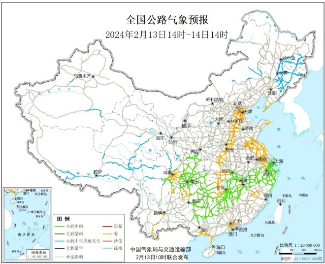 预计13日中午至14日中午,内蒙古东部、黑龙江东南部、吉林中东部、辽宁东北部、新疆西北部、青藏高原大部等地部分道路受小到中雪或雨夹雪影响;江淮南部、江南北部和西部、广西北部、西南地区东部、陕西南部等地部分道路受小到中雨影响。另外,天津中南部、河北东部、辽宁东南部、江苏大部、浙江西北部、福建西部、江西北部、山东北部和东南部、河南中北部和西南部、湖北中部、湖南中北部、广东南部、广西南部、四川中东部、贵州北部、云南中部等地部分道路受雾影响能见度低(见图3和附件1)。
