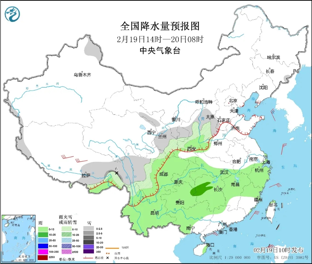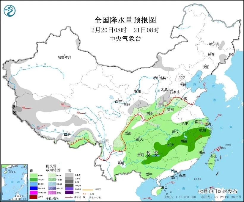 图1 全国降水量预报图(2月19日14时-20日08时)