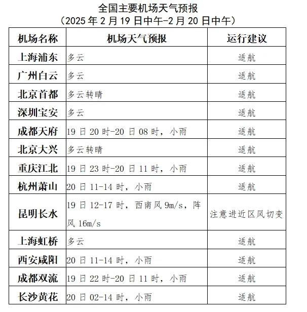 预计19日中午至20日中午,辽宁南部、河北东北部、北京、天津、山东东部、贵州、湖南、江西、浙江南部、福建等地的中低空空域有轻度颠簸;新疆北部、甘肃中部、宁夏南部、内蒙古东部、黑龙江、吉林、辽宁、河北南部、陕西、山西南部、河南、山东西南部、湖北、安徽、江苏等地的低空空域有积冰条件。