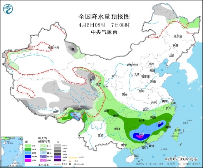 4月5日08时至6日08时,内蒙古东北部、黑龙江西北部、新疆西部山区和南疆盆地及沿天山一带、西藏西部和东南部、青海东南部、甘肃河西和南部、川西高原、云南西北部等地部分地区有小雪或雨夹雪,其中,新疆沿天山一带、西藏东南部等地部分地区有中到大雪(5~9毫米)。西藏东南部、四川盆地南部、重庆南部、江南南部、华南大部等地部分地区有中到大雨,其中,湖南南部、江西南部、福建中南部、广西东北部、广东中北部等地部分地区有暴雨或大暴雨(100~210毫米)。西藏南部、内蒙古中东部、辽东半岛、山东半岛、浙江北部等地部分地区有4~5级风(见图3)。