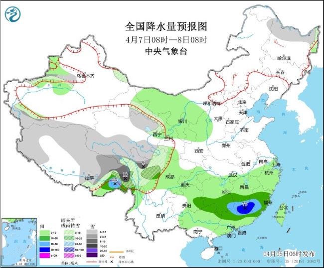 4月7日08时至8日08时,新疆西部沿山和南疆盆地及伊犁河谷、西藏北部和东南部、青海大部、甘肃河西、川西高原等地部分地区有小到中雪或雨夹雪,其中,西藏东南部、川西高原西北部等地部分地区有大到暴雪(10~18毫米)。西藏东南部、江南南部、贵州东南部、华南北部等地部分地区有中到大雨,其中,江西南部、福建西南部、广东东北部等地部分地区有暴雨(50~70毫米)。内蒙古中部、黑龙江西南部等地部分地区有4~5级风(见图5)。