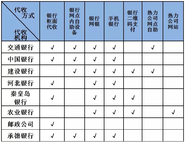 开通代收费银行包括衡水银行、农商银行、邢台银行、邮政储蓄银行、中国银行、河北银行、民生银行、沧州银行、农业银行、建设银行、张家口银行、交通银行等各营业网点,请取暖用户避开交费高峰期提前缴费。(2019-2020年度热计量补费用户请到收费所或微信公众号、支付宝上补缴热费)。
