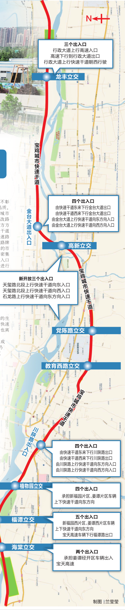 “快速干道二期工程主要包括两个片区和6个点位立交桥的建设,分别是福谭片区的植物园立交桥、福谭立交桥、海棠立交桥,龙山片区的高新立交桥(石鼓山立交桥)、党陈路立交桥、教育西路立交桥,就是为了让市民更便捷地上下快速干道。”市住建局工作人员告诉记者。宝鸡的城市快速干道是全省首条过境高速市政化改造项目,社会各界都十分关注,不少市民都希望在自己家门口设置出入口。但因为过境高速原本承载的作用以及城市已经形成的建筑格局,并不能“随心所欲”地建设出入口。建设出入口的原则,主要是根据用地和地面道路承载力,按照最大化方便市民出行的建设方案来进行。