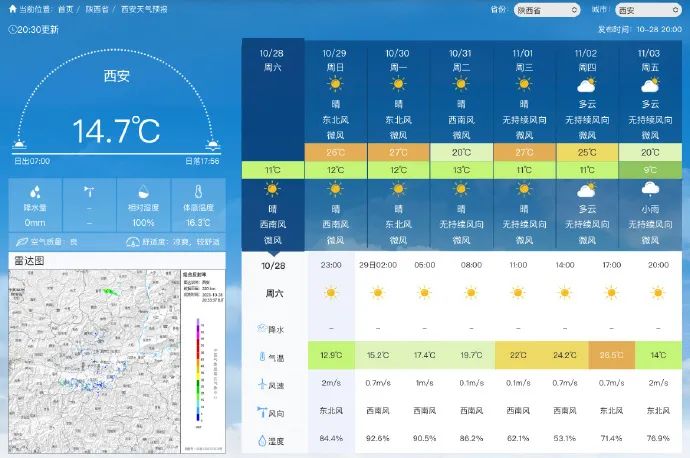 近期西安市以晴到多云天气为主,早晚温差较大,凌晨至早晨山区及河谷地带易出现低能见度天气;