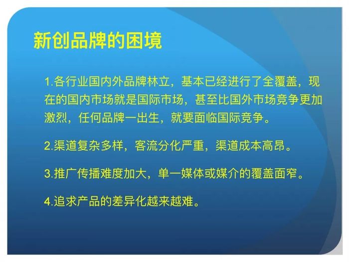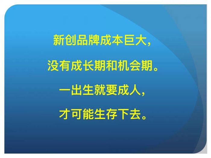 还有一个困境是资金的困境,但这个不在我们的范围里面,所以我们的结论就是新创品牌的成本非常巨大,没有成长期和机会期,一出生就要竞争才能生存下去,你的品牌很难有一个机会去慢慢培养积累经验,或者积累产品差异化的试错,然后我发展了再来慢慢跟你们竞争,这个非常难,非常难我们也要找到办法,否则的话,我们的创业该怎么来进行呢?