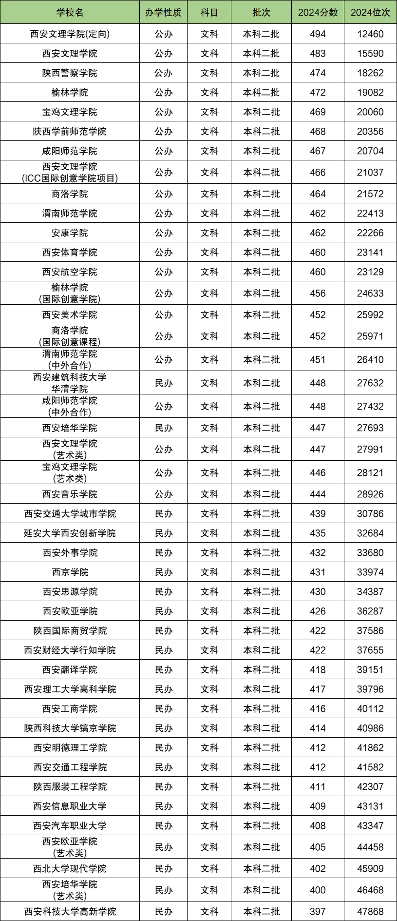 下文为2024年陕西省二本大学在陕西文科录取分数线和位次排名表,供大家参考: