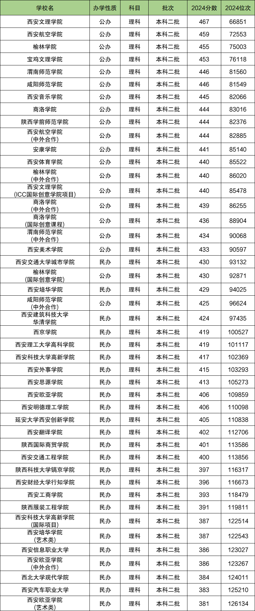 下文为2024年陕西省二本大学在陕西理科录取分数线和位次排名表,供大家参考: