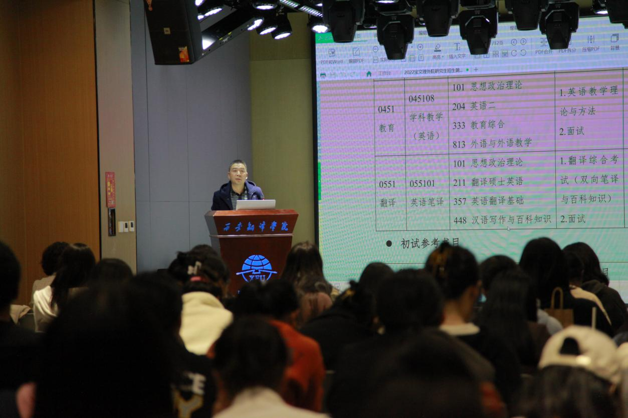 10月15日,副院长史传龙教授应邀前往西安翻译学院英文学院做2022年研究生招生宣讲。西安翻译学院英文学院近百名本科生参加宣讲会。宣讲会由西安翻译学院英文学院副院长李燕教授主持。