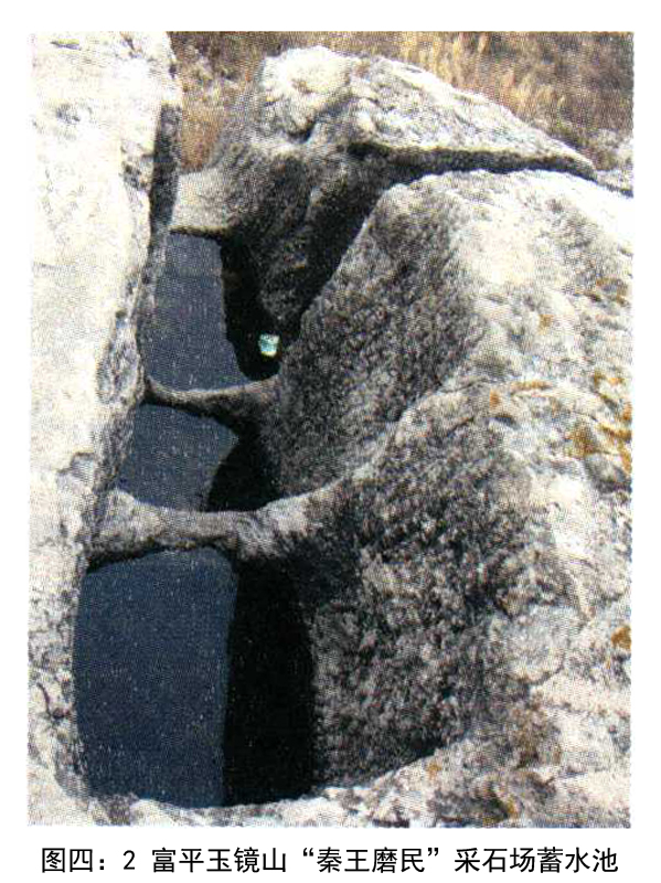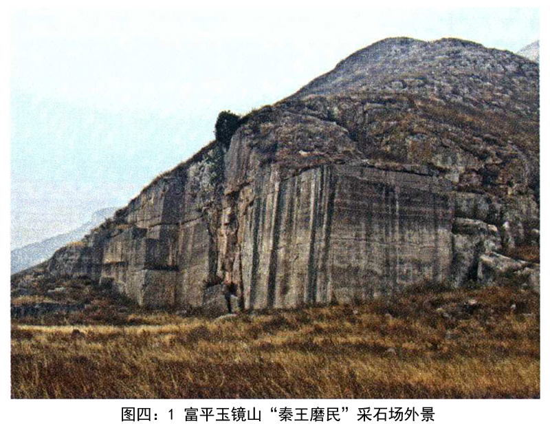 2009年年末,我们去富平进行秦陵石铠甲研究课题调研,意外地发现了玉镜山“秦王磨民”大型采石场,采石场规模宏大,气势磅礴。半座小山,如刀削一般,采石场还发现有蓄水池。[16](图四:1、2)虽然是人工开凿,却有鬼斧神工之效,令人惊叹震撼,当时我们就自然而然地联想到,这应该是秦始皇的杰作。玉镜山石料质地细,硬度大,除其他用途外,应用于秦陵地宫当属自然之事。我们也希望通过石料对比,对秦始皇帝陵园及其地宫的石材来源、加工、用途进行专题研究,与有志于秦陵研究者们共勉。