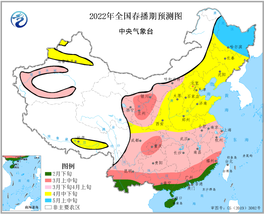 全国大部农区春耕春播农事活动已于2月下旬陆续开始,由南至北持续至5月上中旬,预计华南南部春播期主要集中在2月下旬至3月上旬;华南中北部、云南中南部、四川盆地、西北地区中东部将于3月上中旬进入春播期;江南、江汉、江淮、西南地区大部和新疆南部春播期在3月下旬至4月上旬;黄淮、华北、东北地区大部、新疆北部春播期主要在4月中下旬;东北地区北部部分农区春播期在5月上中旬(图1)。