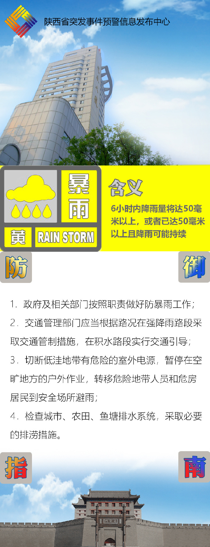 目前西安市临潼区、未央区、西咸新区、高陵区、雁塔区、长安区、鄠邑区、周至县、阎良区降水量已达50毫米以上且降雨持续,预计未来6小时内雁塔区、灞桥区、未央区、阎良区、临潼区、长安区、高陵区、鄠邑区、周至县、西咸新区部分地方累积降雨量将达50毫米以上,提请相关部门、相关区县做好城乡积涝、山洪、中小河流洪水及滑坡、泥石流、崩塌等次生灾害防范工作。