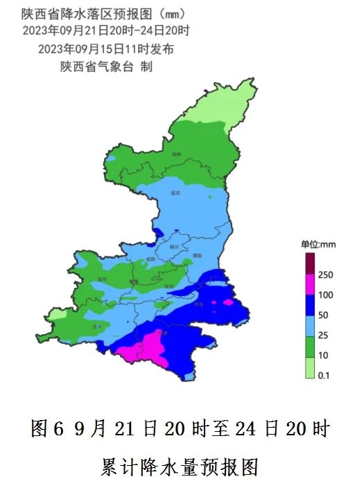 后期22-24日全省有小到中雨,陕南部分地方有大到暴雨。累计降水量:陕北北部5~25毫米,陕北南部、关中、汉中西部20~50毫米,汉中东部、安康、商洛35~70毫米,局地70~120毫米(图6)。