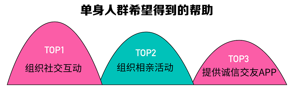 此外,在脱单这件事上,单身人群希望得到的帮助主要为:获得参与以兴趣爱好为主的社交活动的机会、参与相亲活动以及开发出有诚信的线上交友产品。
