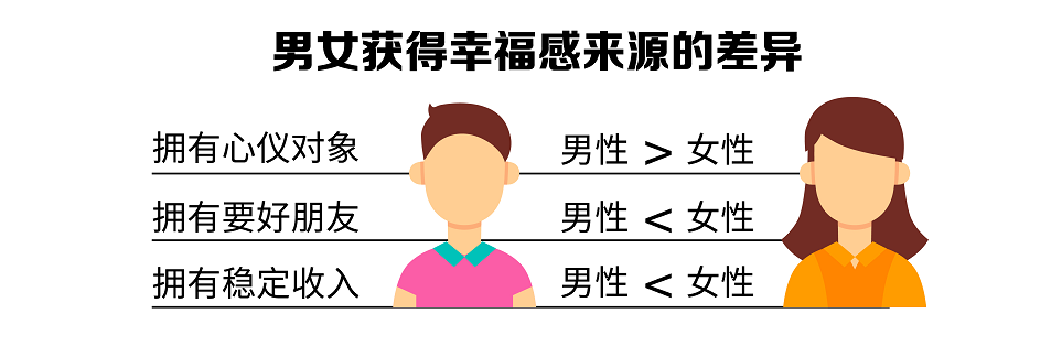 深入研究发现,男性对“拥有心仪的对象”的需求比例(6.67%)略高于女性(3.17%),女性则是在拥有要好朋友的比例(28.79%)上高于男性(6.67%),且因为稳定收入感到幸福的女性比例(60%)比男性(53%)更高。可见,女性更容易从稳定的收入中获得幸福感。