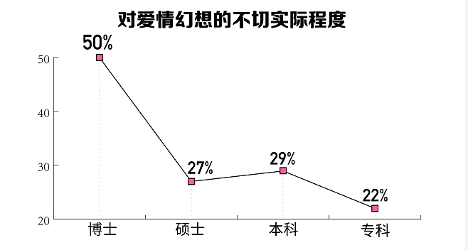 调查结果发现,圈子小(40%)、工作忙(15%)、对爱情幻想过于完美(12%)为90后单身的主要原因。就性别差异而言,除了圈子小之外,男性单身的主要原因为性格内向不擅交际(33.53%)、工作忙(32.07%)以及经济条件不理想(19.02)。女性单身的主要原因则是对爱情幻想过于完美(29.67%)、工作忙(28.04%)及性格内向不擅交际(14.82%)。从学历背景看,学历越高越容易受困于生活圈子小和工作忙带来的择偶问题,而且博士人群对爱情幻想过于完美的比例比学历相对较低的人群更高。