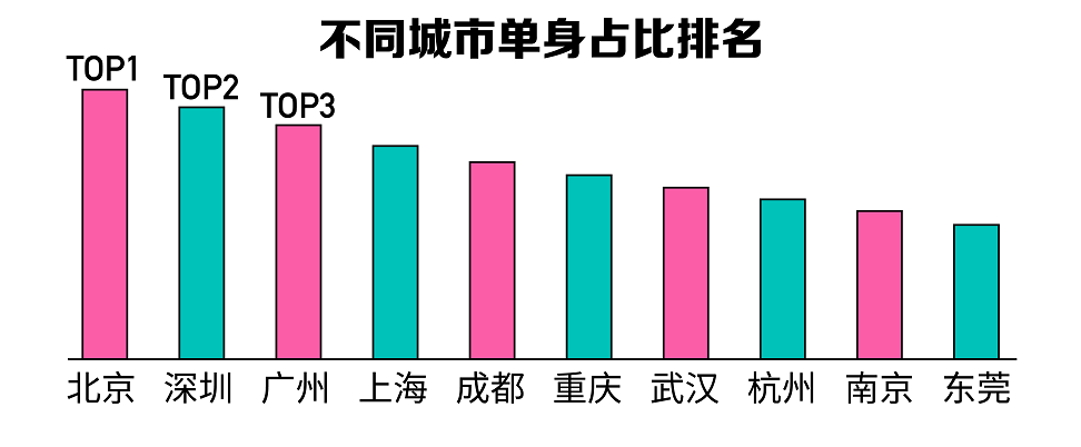 此次调查数据显示,就单身人群城市分布情况来看,单身90后主要聚集在:北京、深圳、广州、上海、成都、重庆、武汉、杭州、南京、东莞。北、上、广、深位居前四,一线城市单身占比持续领先。此外,与“本地人”相比,流动人口的单身比例更高。