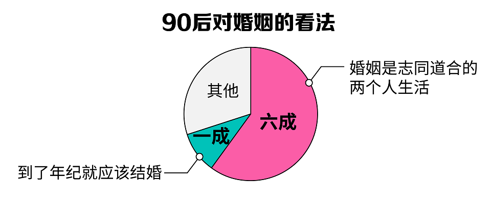 近6成90后认为婚姻是志同道合的两个人生活,认为到了年纪就应该结婚、婚姻是爱情的保障的单身男女则不到1成(7.97%)。另外,有近7成90后认为成家立业可同时进行,有11%的90后认为可以先成家后立业。