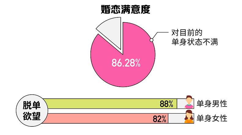 针对婚恋满意度的调查显示,超8成(86.28%)单身男女对自己目前的单身状态表示不满,渴望改变,同时愿意付诸行动来改变现状。从性别差异看,单身男性(88%)比单身女性(82%)更急于脱单,渴望改变现状。