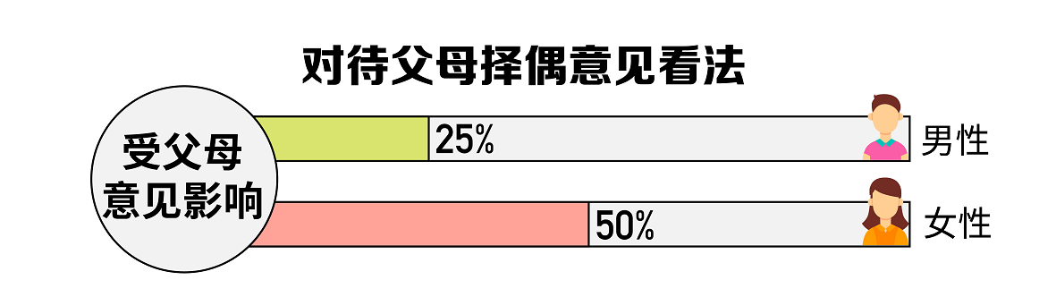 面对父母的择偶建议,50%的女性会受到父母的意见影响,仅25%的男性会受到影响,可见,女性比男性更“听妈妈的话”。另外,从地域来看,“本地人”青年更容易受到父母的影响。