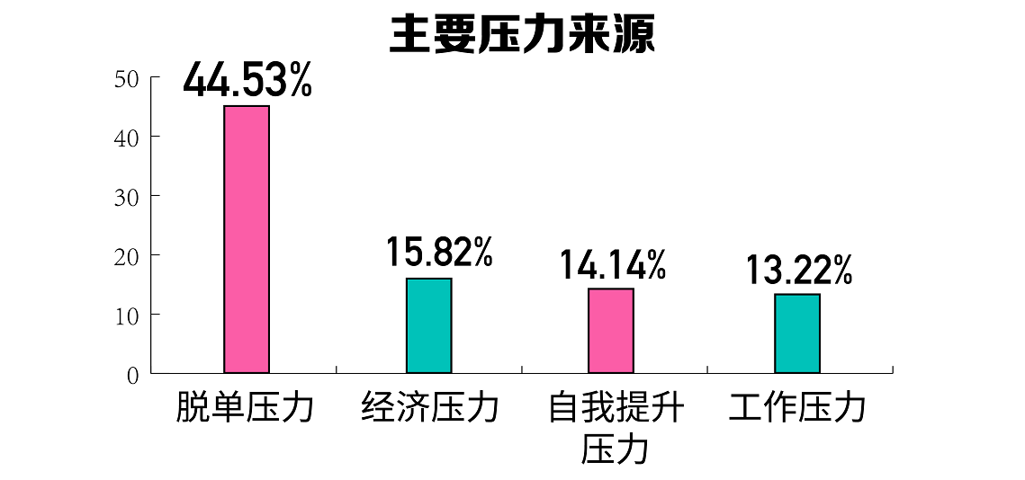 脱发、熬夜、加班、压力山大似乎成了单身90后的家常便饭,调查显示,单身男女主要的生活压力是脱单压力(44.53%),其次是经济压力(15.82%)、自我提升压力(14.14%)及工作压力(13.22%)。既为单身状态焦虑,又要考虑工作、经济等物质方面的压力,是他们的生活常态。