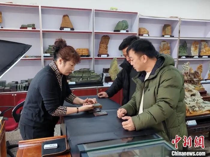 3月1日,吉林白山,游客在一家松花石馆选购松花石砚。 王浩宇 摄