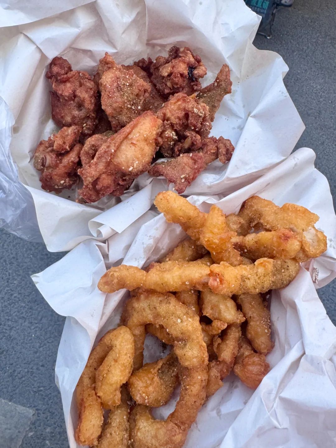 每次去都要排队的炸鸡老店,只有炸鸡翅和炸鸡柳两种。炸鸡翅的味道是真的赞!咸香入味,越嚼越香,细品略微带一点甜头,一口一口停不下来。