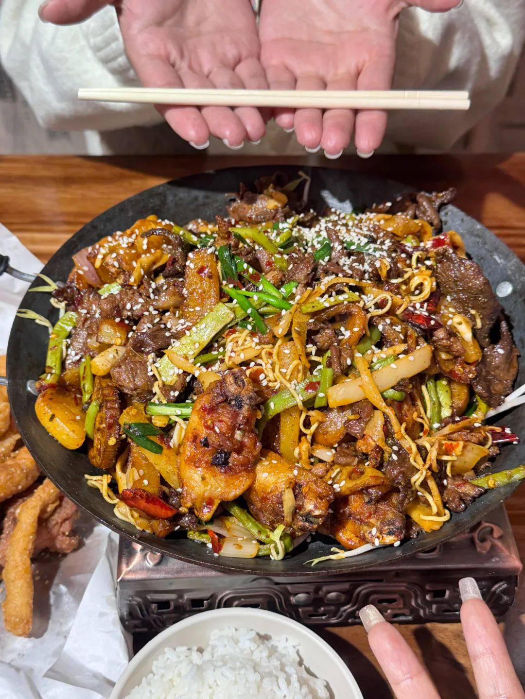 便宜又好吃的临街小店,主菜可以选择牛肉/肥肠/鲜虾/五花肉/鸡翅/排骨中的食材,可单点可双拼,再加两样配菜就可以美餐一顿了。配菜强推藕片,非常软糯入味!两人一锅刚刚好,超级下饭!
