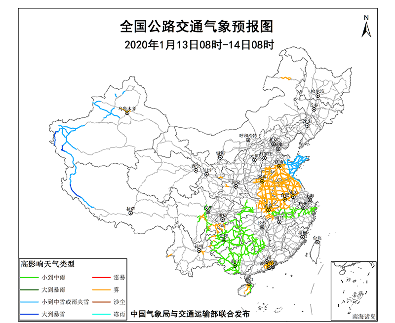 图3 全国公路气象预报图(1月13日08时至14日08时)
