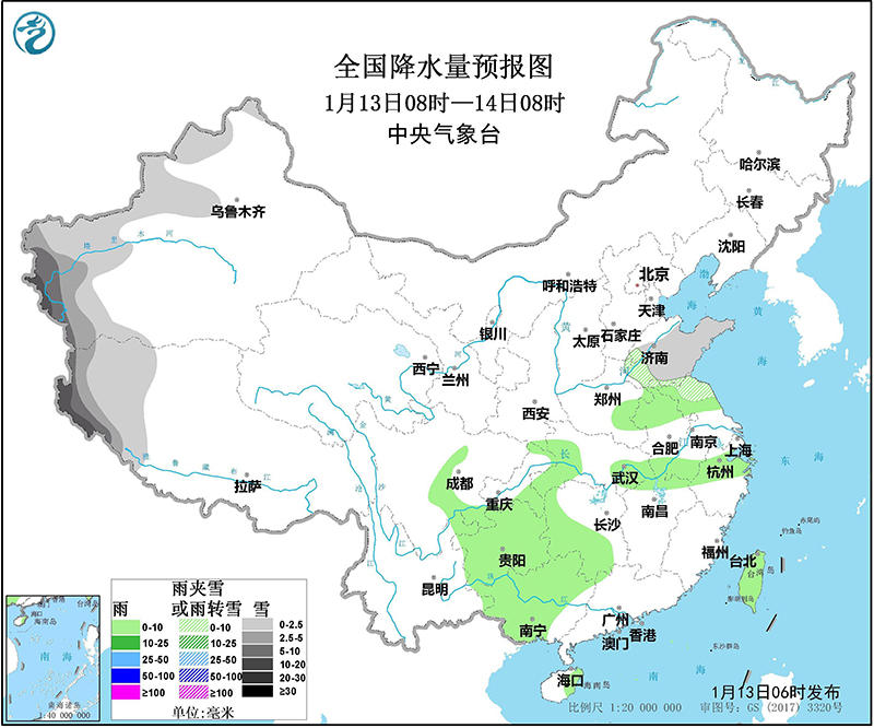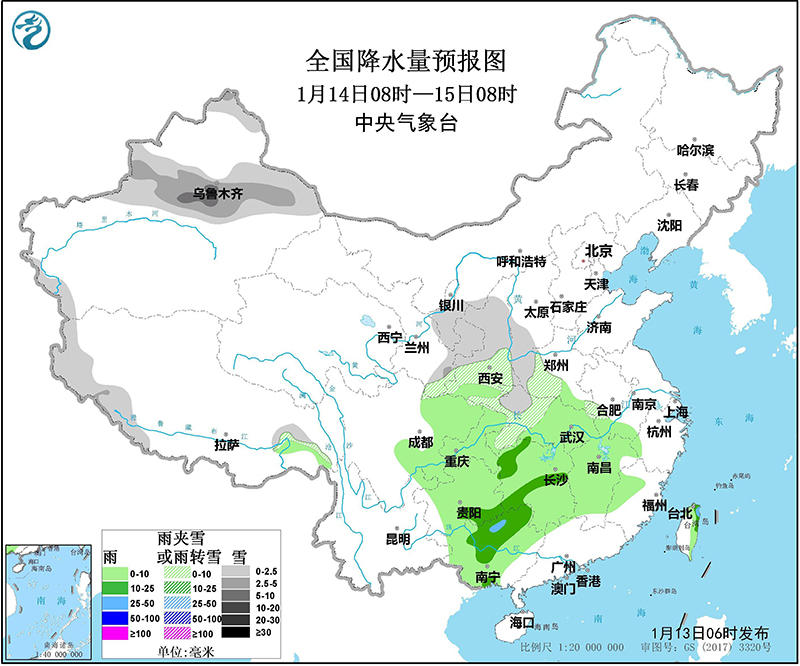 图1 全国降水量预报图(1月13日08时-14日08时)