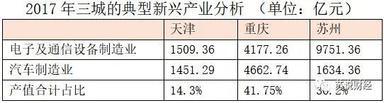 汽车制造业、电子通信产业是新兴产业的典型代表。2017年三个城市均将这两个产业作为支柱产业。但从具体产值看,苏州的电子通信产业较为发达,国内仅次于深圳(1.92万亿),但远高于重庆、天津,也高于北京、上海、广州等一线城市。重庆的这两个产业发展较为均衡,“两条腿”稳健走路。而天津的这“两条腿”就明显短了一大截,基本是重庆相应产业产值的1/3。
