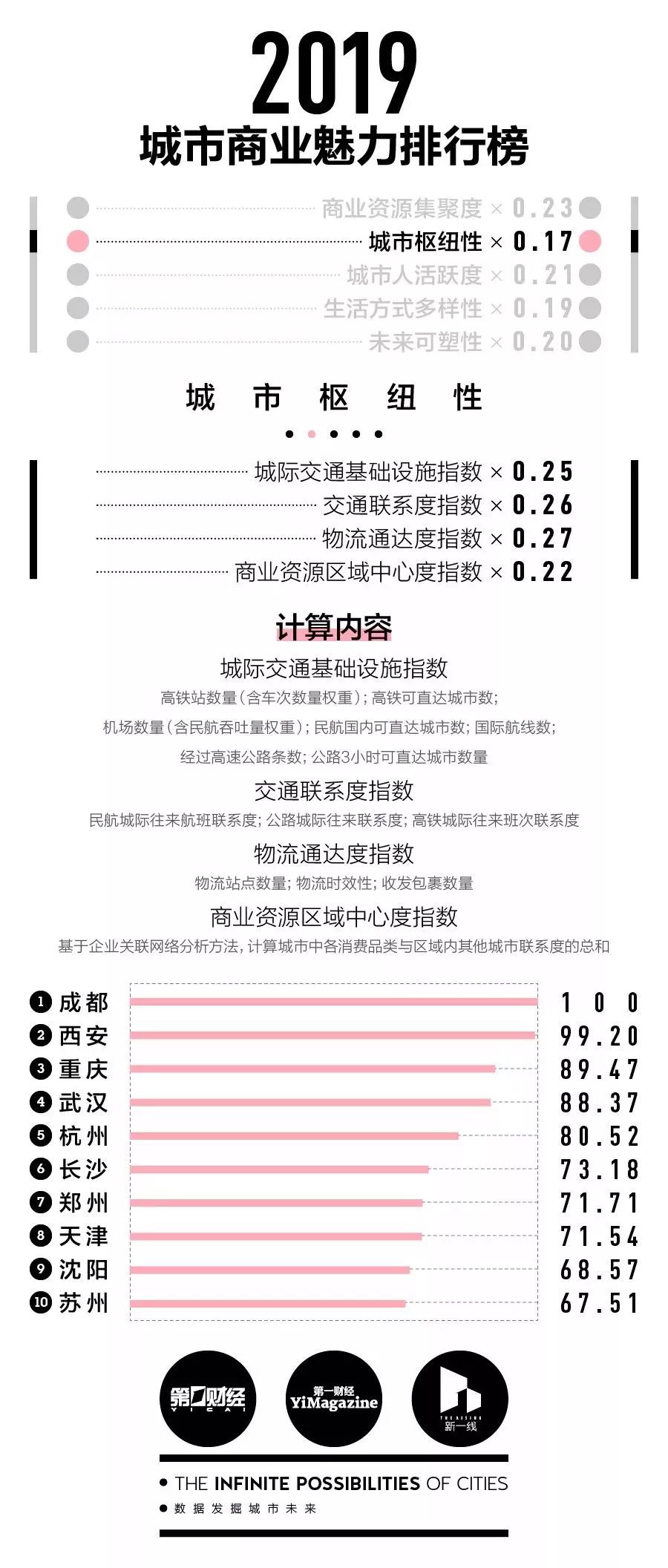 榜单依据170个主流消费品牌的商业门店数据、18家各领域头部互联网公司的用户行为数据和数据机构的城市大数据,按照商业资源集聚度、城市枢纽性、城市人活跃度、生活方式多样性和未来可塑性五大维度指数来评估337个中国地级及以上城市。